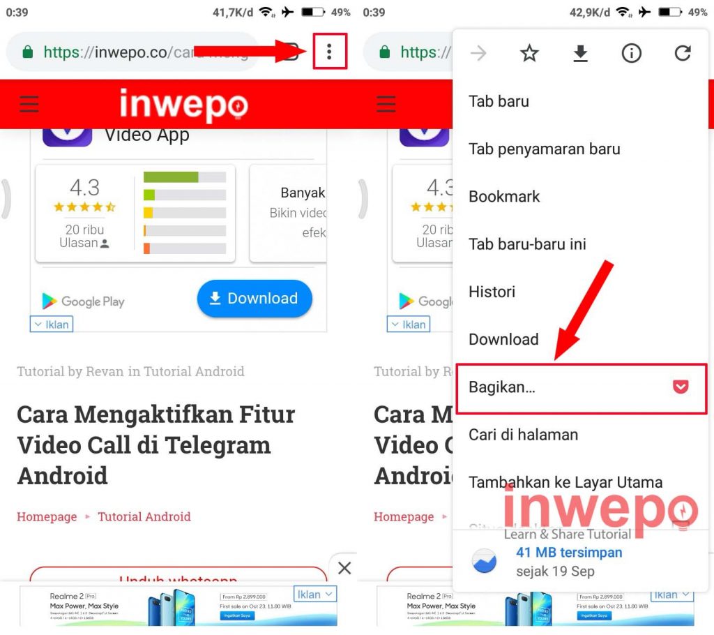 3. Langkah ketiga, tap 3 titik hitam yang berada di pojok kanan atas untuk memunculkan menu yang lain, berikutnya tap menu Bagikan.