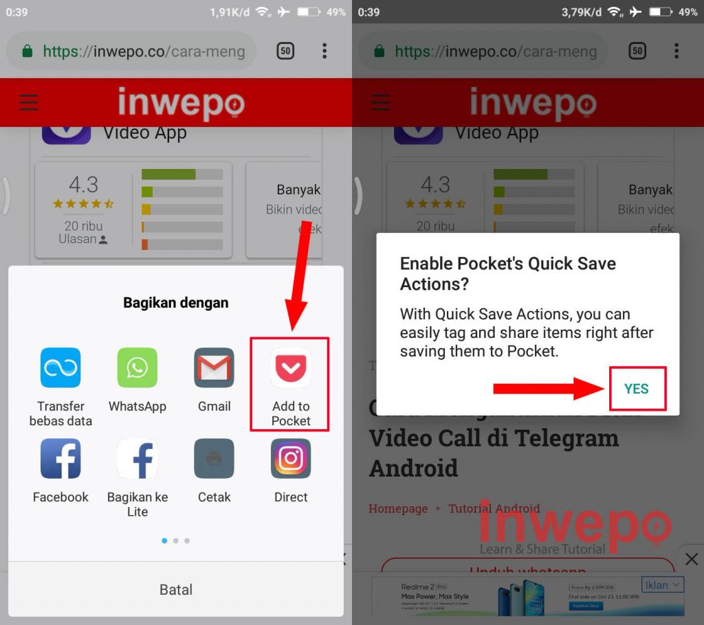 4. Langkah keempat, pilih Add to Pocket kemudian akan muncul notif untuk mengaktifkan Quick Save untuk aplikasi Pocket, tap saja YES.