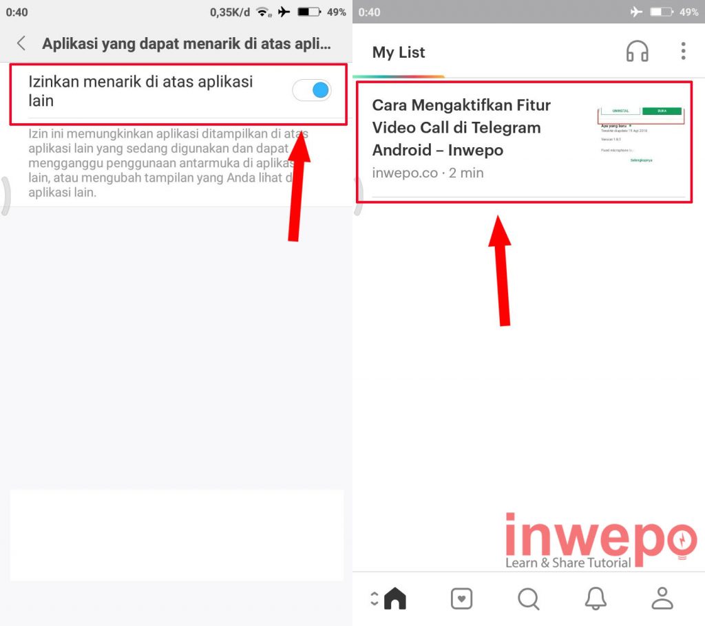 5. Langkah kelima, aktifkan tombol Izinkan menarik diatas aplikasi lain. Selanjutnya buka aplikasi Pocket dan tap laman website yang sudah kita simpan sebelumnya.