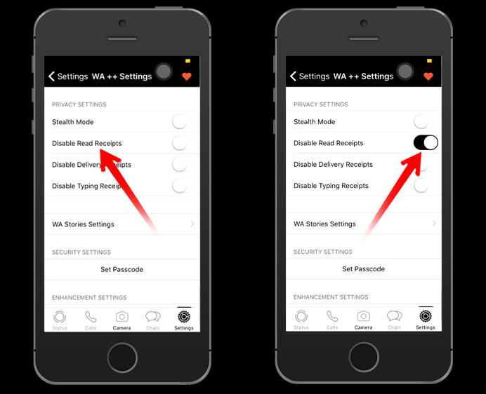 5. Buka aplikasi WhapssApp++ – masuk Pengaturan – Tap menu WA ++ Setting – aktifkan Disable Read Receipts