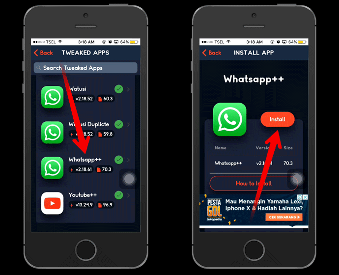 4. Cari WhatssApp++ – Tap Install – akan muncul pesan, Tap Install lagi.