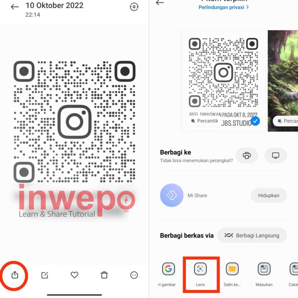 1. Buka kode QR yang tersimpan dalam galeri atau smartphone kalian. Lalu tap menu upload atau kirim. Pilih kirim berkas file Kode QR dengan menu Lens atau Google Lens.
