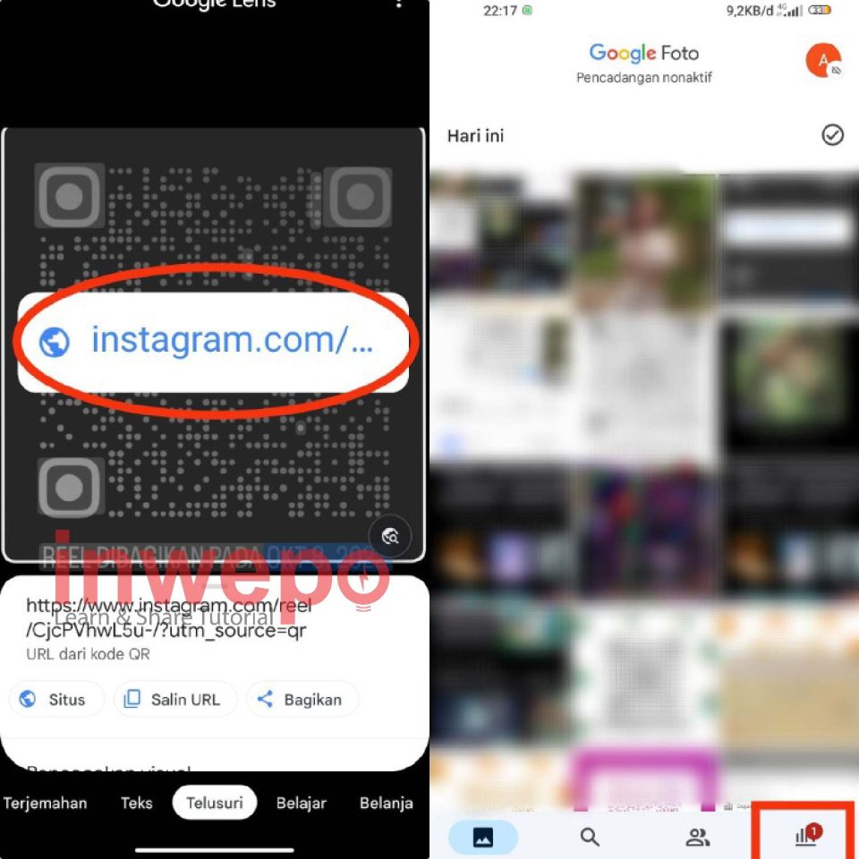 2. Lens akan memindai Kode QR beberapa saat selanjutnya dia akan memunculkan informasi dari QR yang sudah kalian kirimkan. Selanjutnya menggunakan aplikasi Google photo tak jauh berbeda kalian bisa tap icon grafik di bagian bawah.