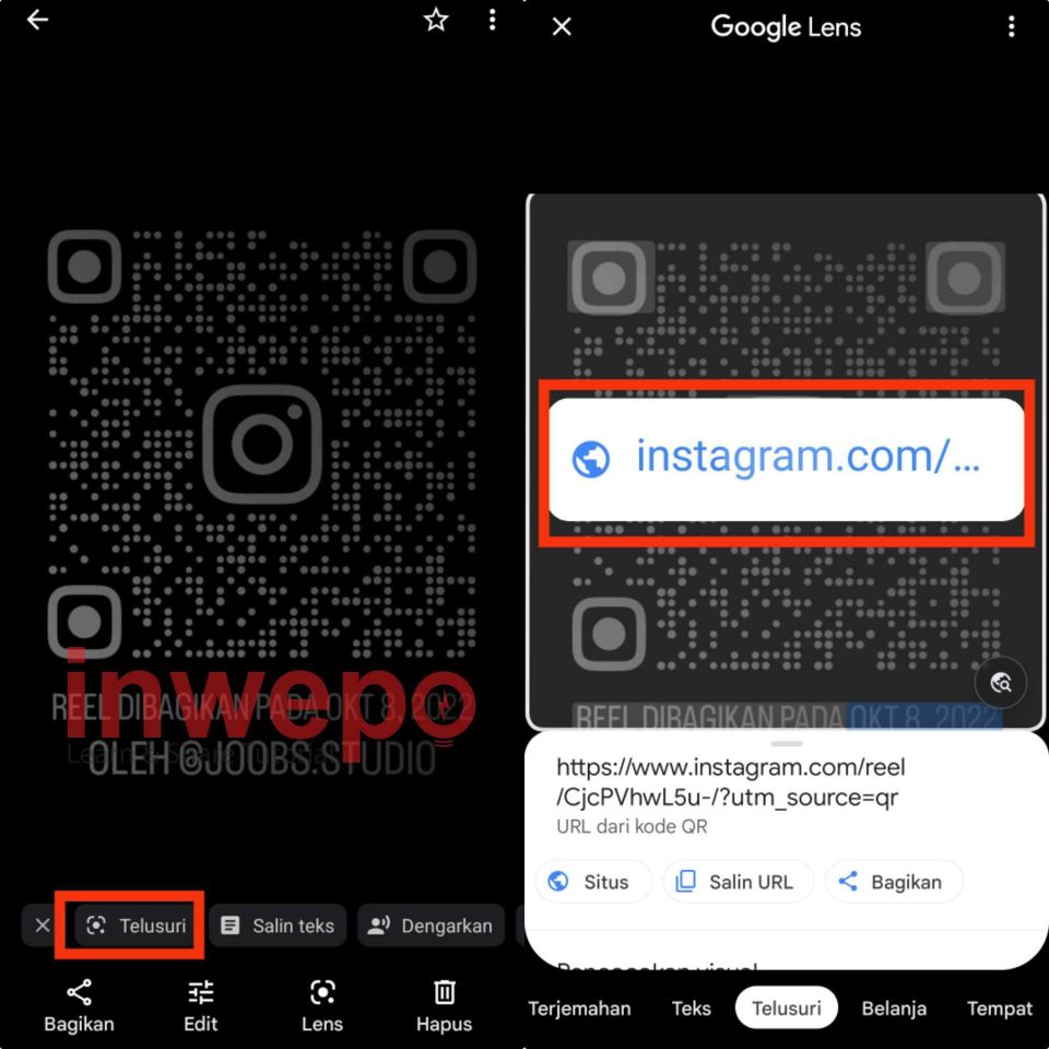 3. Pilih Gambar kode QR yang sudah tersimpan lalu tap menu Telusuri. Hasilnya tidak jauh berbeda saat kita menggunakan Google lens.