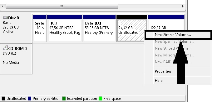 10. Selanjutnya klik kanan pada hasil shrink tadi dan pilih “New Simple Volume”.