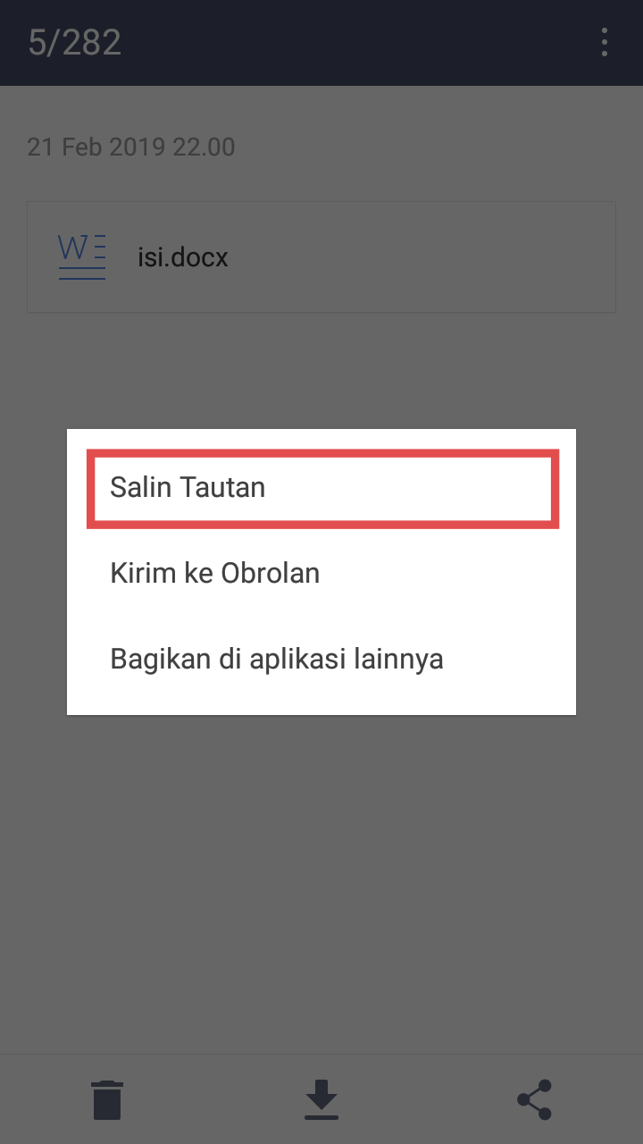 3. Setelah menampilkan kanal opsi, pilih opsi Salin Tautan. Nantinya, kita akan diberikan salinan dari link yang terkait dengan file yang akan kita bagikan kepada kerabat kita.