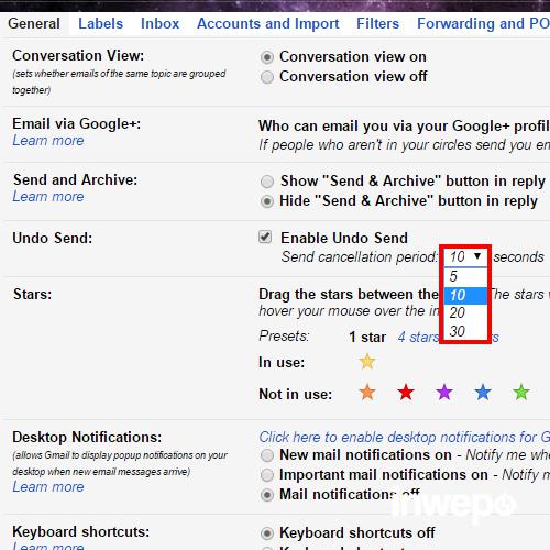 3. Setelah pilihan Enable Undo Send dicentang, pilihan waktu di bawahnya akan aktif dan kamu bisa memilih berapa lama delay yang kamu butuhkan sebelum pengiriman berhasil.