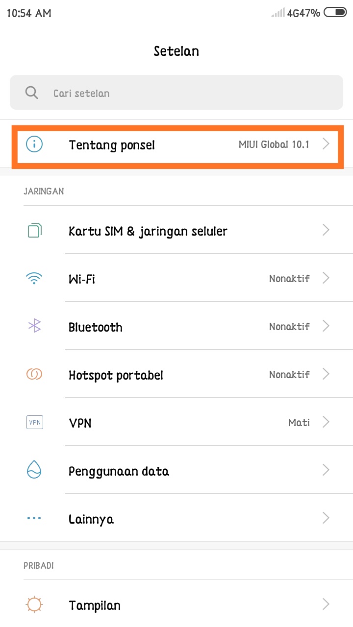1. Buka menu Setelan / Settings – kemudian pilih menu Tentang Ponsel / About Phone.