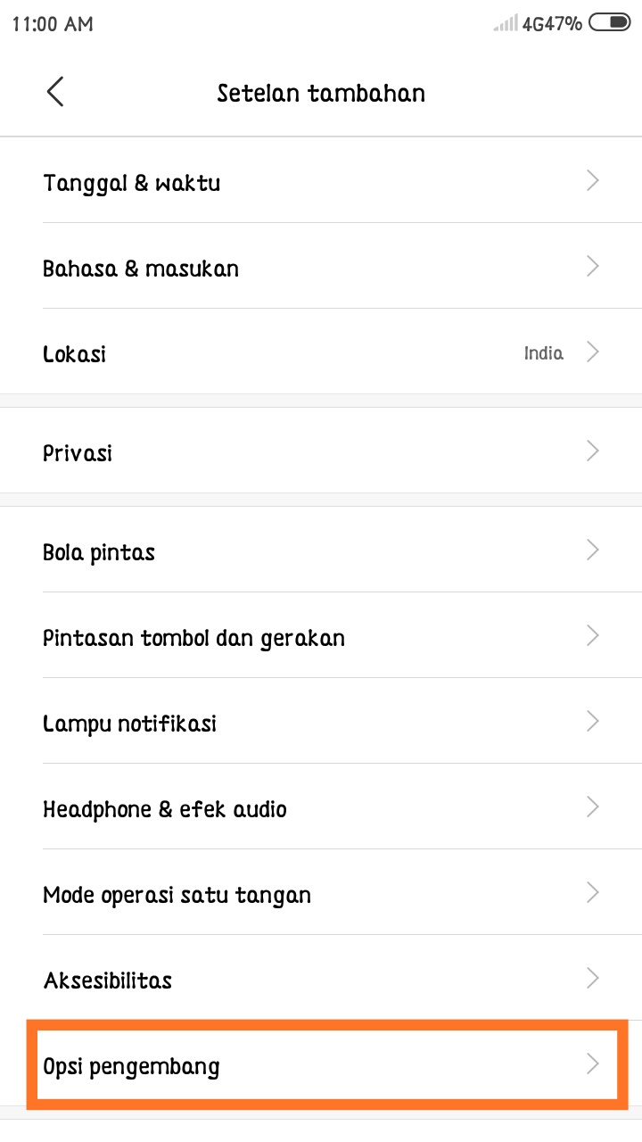 3. Pilih menu Setelan Tambahan / Additional Settings – kemudian pilih menu Opsi Pengembang / Developer Options.