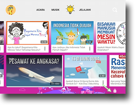 1. Buka aplikasi YouTube Kids. Apabila sudah masuk ke beranda, silakan ketuk lambang gembok.