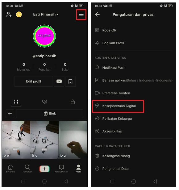 Pilih menu Profile untuk membuka pengaturan akun Tik Tok kamu dan tekan ikon tiga garis untuk membuka menu Pengaturan dan Privasi. Scroll kebawah menu Pengaturan dan Privasi, dantekan menu Kesejahteraan Digital.