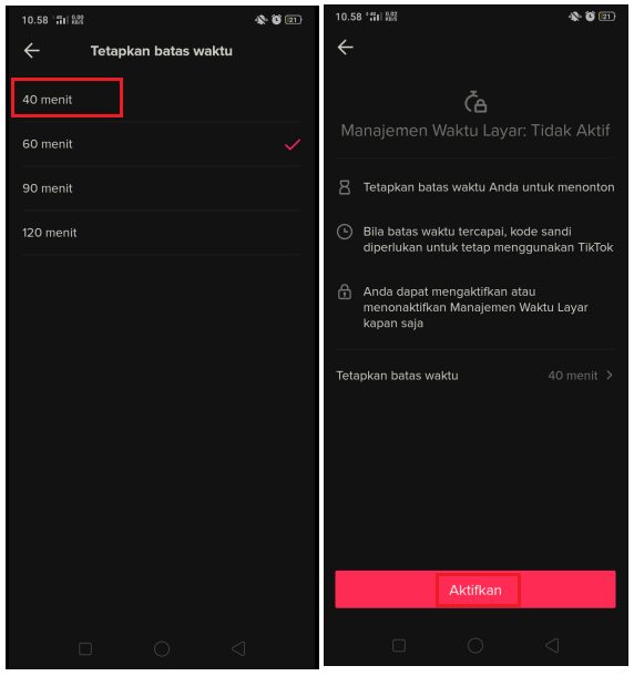 Ada empat pilihan jangka waktu menonton video Tik Tok yaitu 40 menit, 60 menit, 90 menit, dan 120 menit. Pilih dan klik salah satu waktu yang tersedia. Setelah itu, klik tombol Aktifkan.