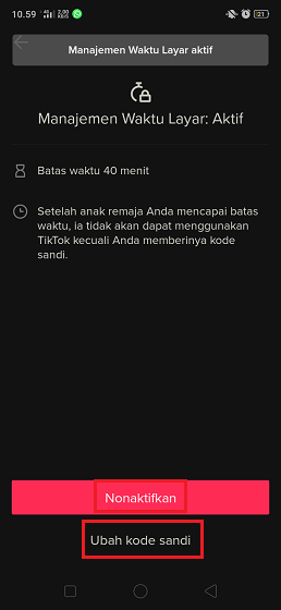 5. Selesai, kini fitur Manajemen Waktu Layar sudah aktif. Tekan tombol Nonaktifkan untuk mematikan fitur Manajemen Waktu Layar, atau Tekan tombol Ubah kode sandi untuk mengubah sandi di fitur Manajemen Waktu Layar.