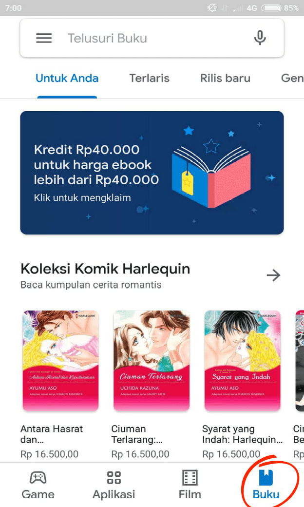 1. Buka aplikasi Google Play Store  – Pilih Menu Buku.