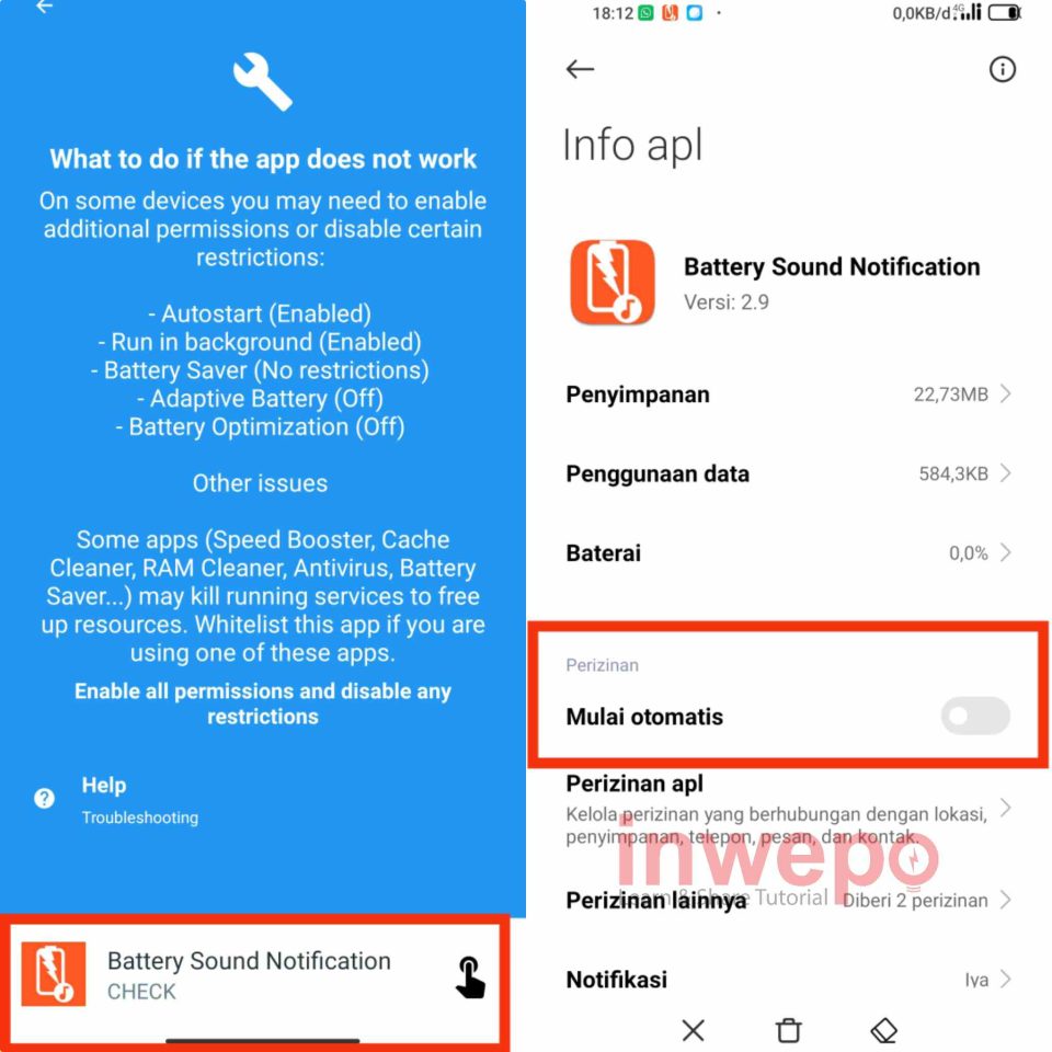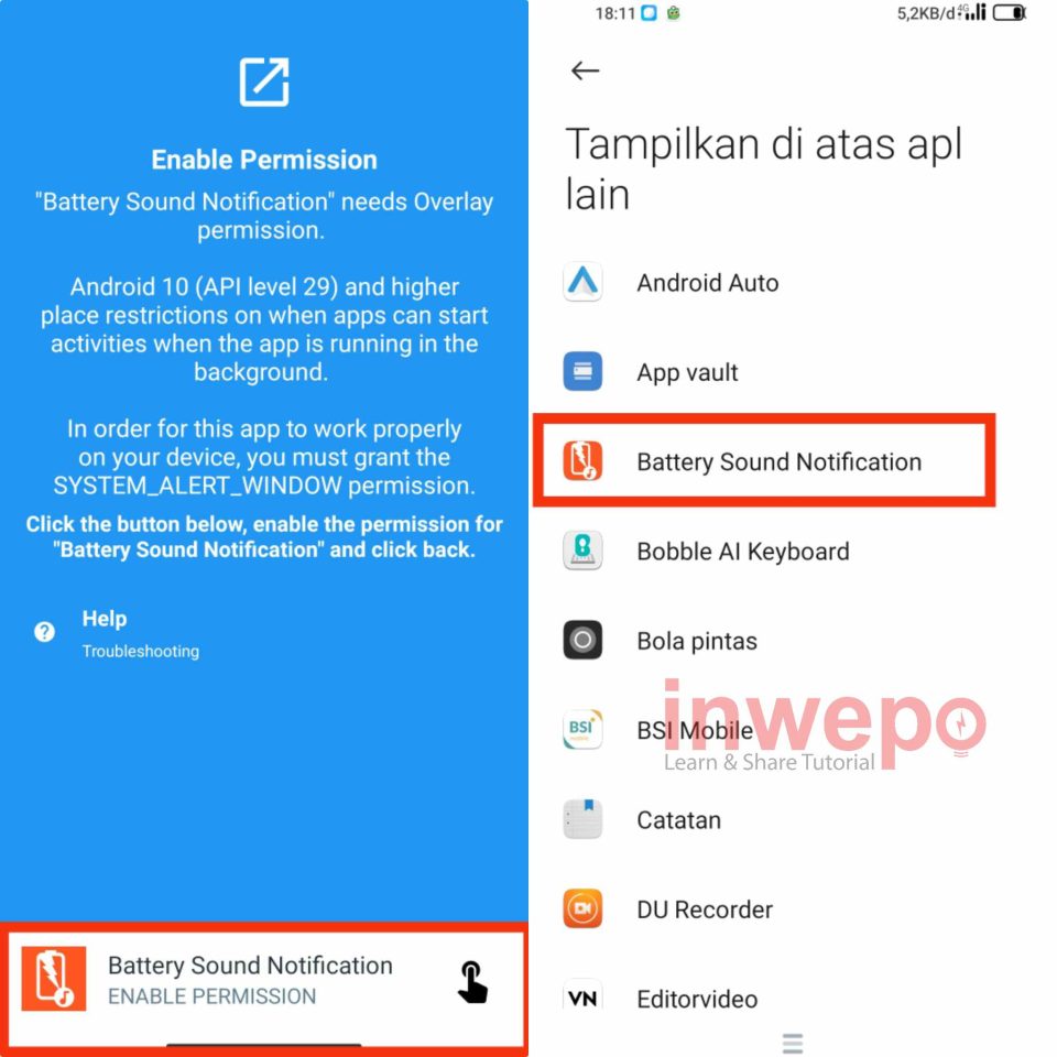 2. Buka aplikasi Battery Sound Notification, lalu tap menu Enable Permission di bagian bawah. Kemudian pilih lagi aplikasi Battery Sound Notification.