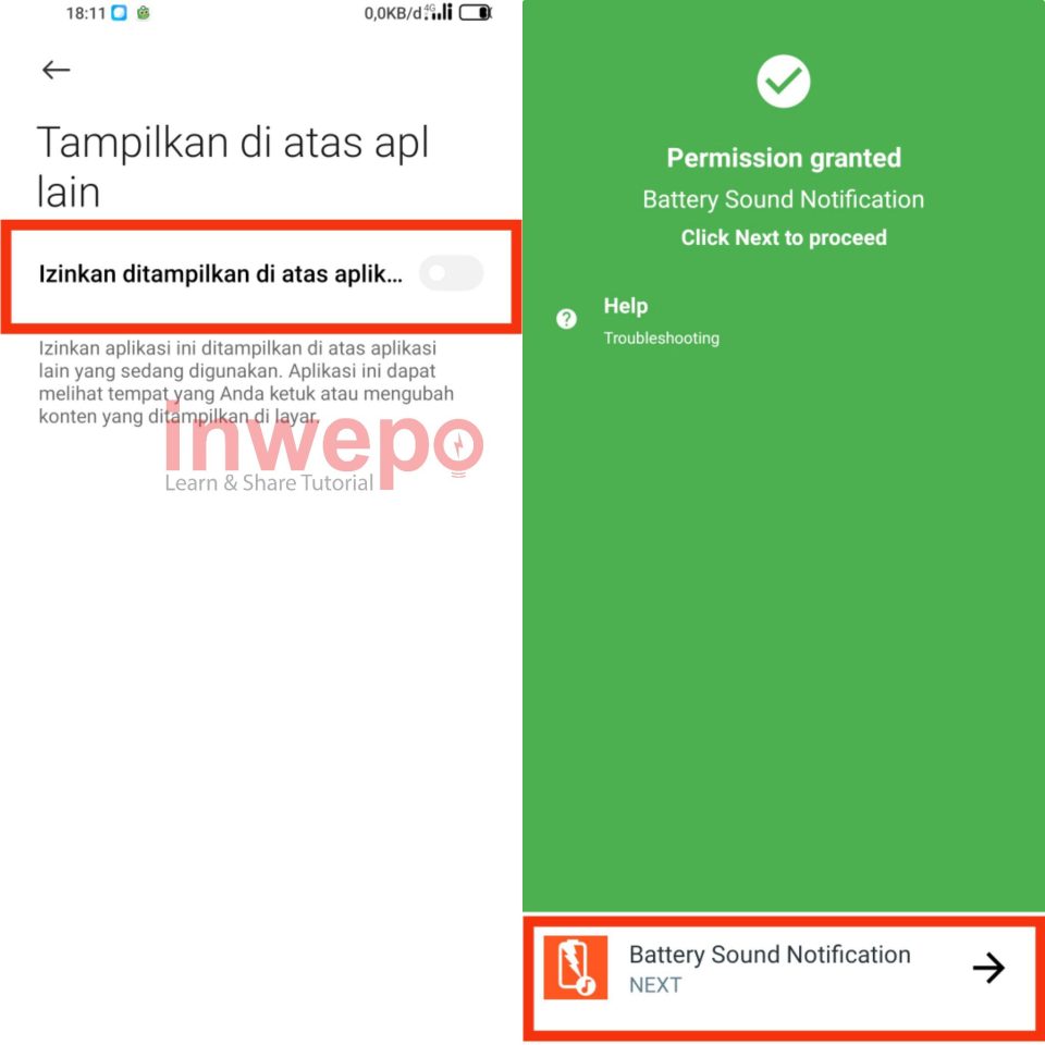 3. Aktifkan menu Izinkan di tampilkan diatas aplikasi lain. Lalu ketika izin akses sudah di terima pilih lagi menu Next yang ada di bagian bawah.