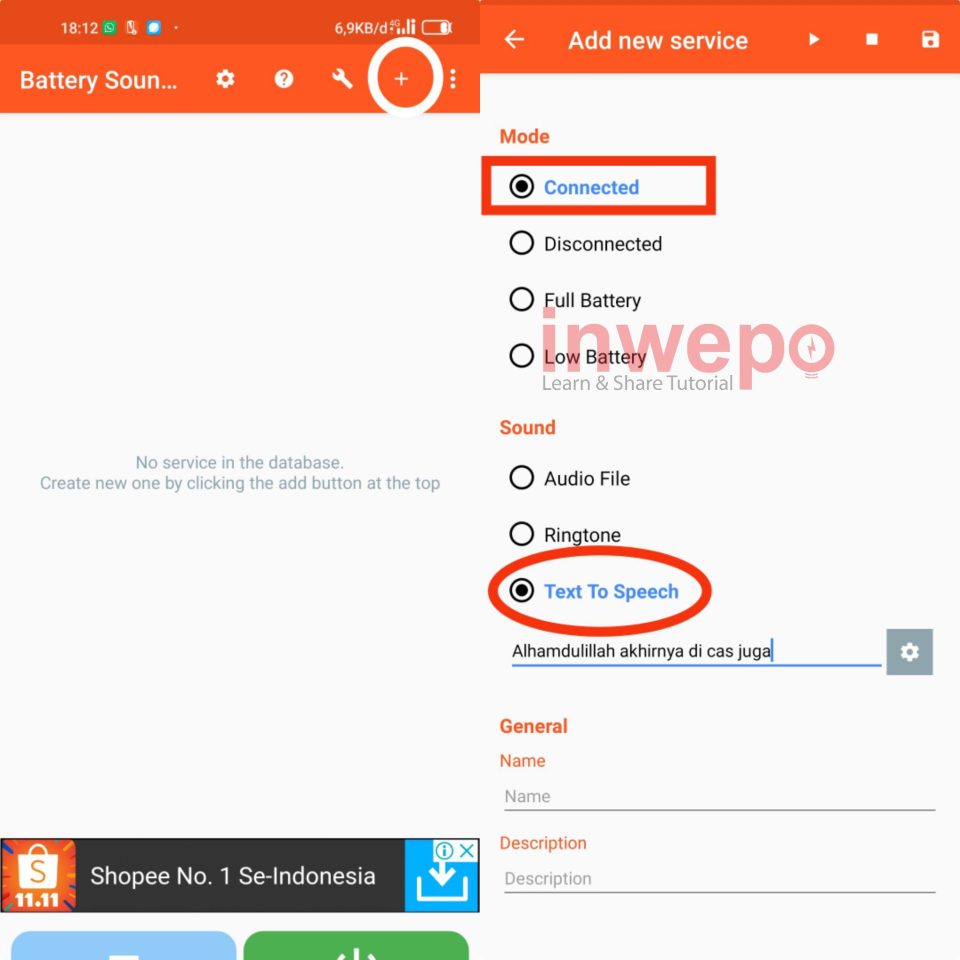 5. Tap icon plus di bagian atas untuk menambahkan aksi. Ada 4 mode yang bisa kalian pilih disini kalian bisa memilih salah satu. Jika ingin bersuara saat di charge maka pilih yang paling atas. Untuk soundnya kalian bisa menggunakan audio atau sound yang ada di smartphone kalian. Kalau ingin lebih unik gunakan menu Text To Speech lalu ketikkan suara yang keluar saat ponsel di charge. Jangan lupa simpan pengaturan menggunakan menu Disk di bagian atas.