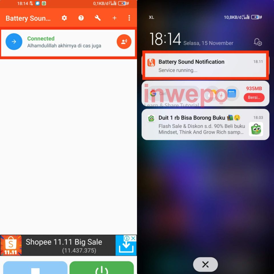 6. Jika sudah kalian akan melihat status running di menu bar atau Notification yang ada di bagian atas. Saat ponsel di charge atau di colokan ke kabel usb maka otaomatis ia akan menggeluarkan suara seperti yang sudah di setting sebelumnya.