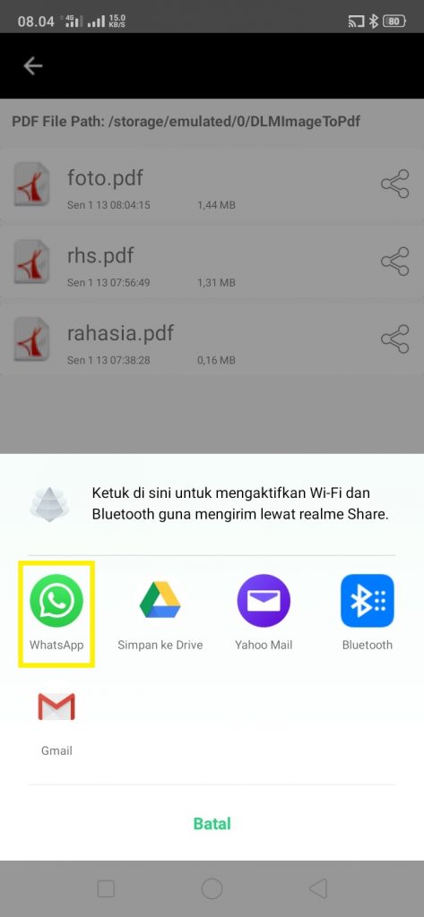 9. Pilih WhatsApp. Sebenarnya selain mengirim ke WhatsApp, kamu juga bisa mengirim foto lewat Bluetooth, atau kirim email.