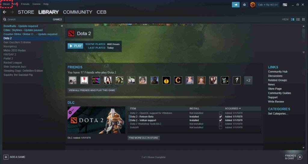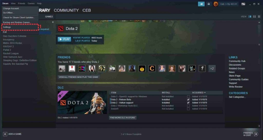 1. Buka aplikasi Steam. Setelah masuk ke menu utama, pilih pengaturan steam pada bagian pojok kiri atas.