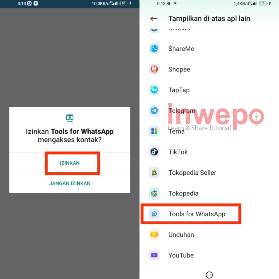 2. Saat membuka pertama kali, kalian akan diminta untuk memberikan izin akses. Tap Izinkan pada pop up menu yang muncul. Berikutnya pada menu Tampilkan diatas aplikasi lain pilih Tools for Whatsapp.