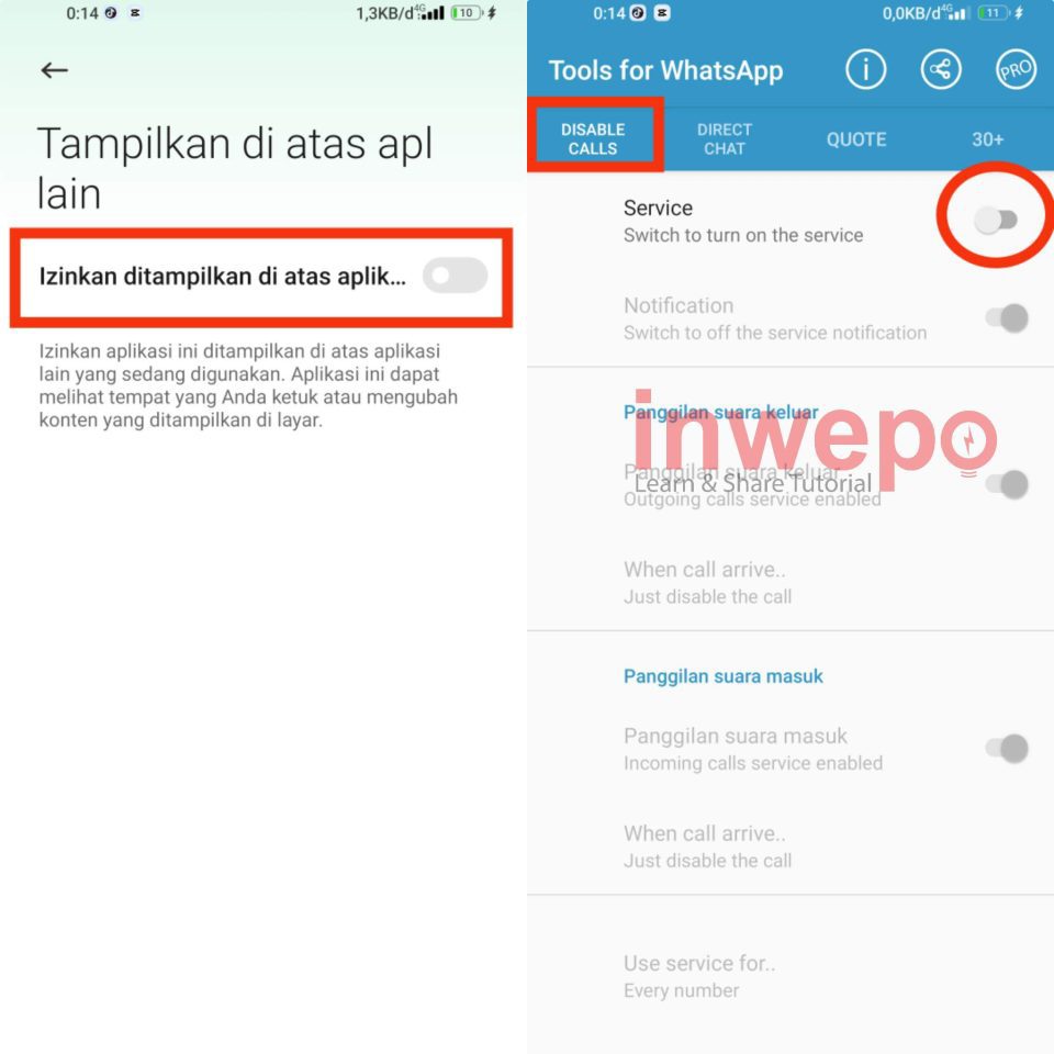 3. Aktifkan menu Izinkan ditampilkan diatas aplikasi lain. Kemudian pada menu Disable Calls aktifkan menu Service.