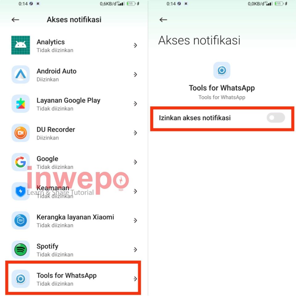 4. Tap Tools for Whatsapp di menu Akses Notifikasi, kemudian tap atau aktifkan menu Izinkan akses notifikasi pada aplikasi Tools for Whatsapp.