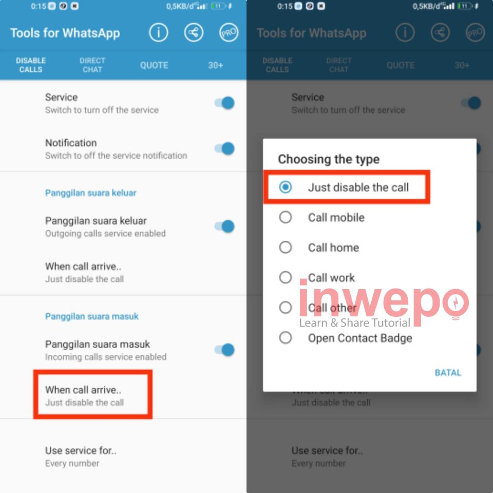 5. Tap menu When Call Arrive, selanjutnya untuk memblock panggilan masuk secara otomatis tap atau pilih menu Just disable the call. Nah, nanti secara otomatis aplikasi akan bekerja dan memblock semua panggilan masuk ke akun WhatsApp kalian.