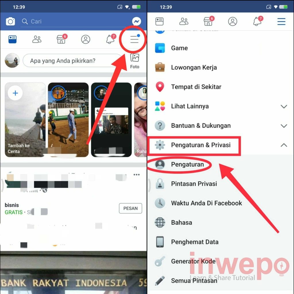 1. Buka aplikasi Facebook Android kemudian tap icon 3 garis yang berada di pojok kanan atas kemudian pilih menu Pengaturan & Privasi lalu tap menu Pengaturan.
