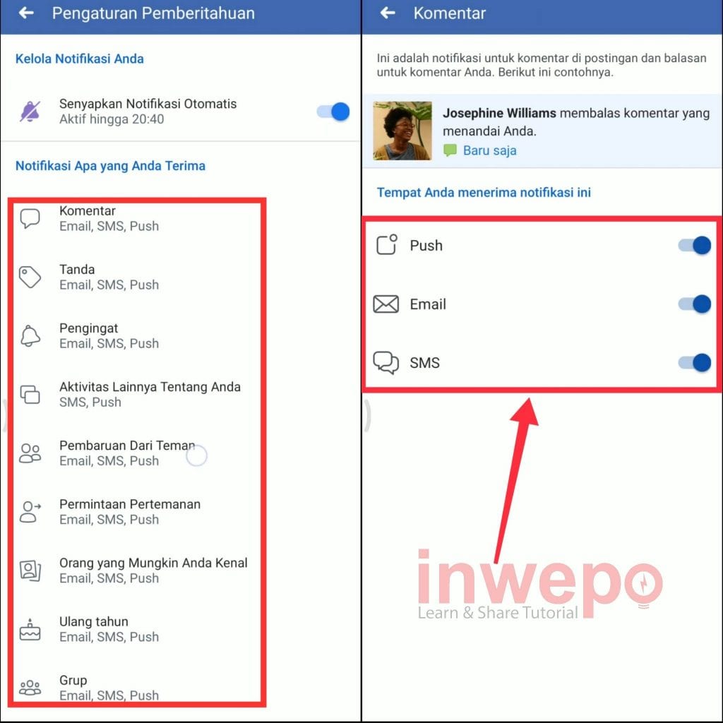 3. Pada bilah menu Notifikasi Apa yang Anda Terima, tap dan pilih salah satu yang ingin di blok misalnya komentar. Selanjutnya nonaktifkan semua mulai dari push notification, email, dan sms.