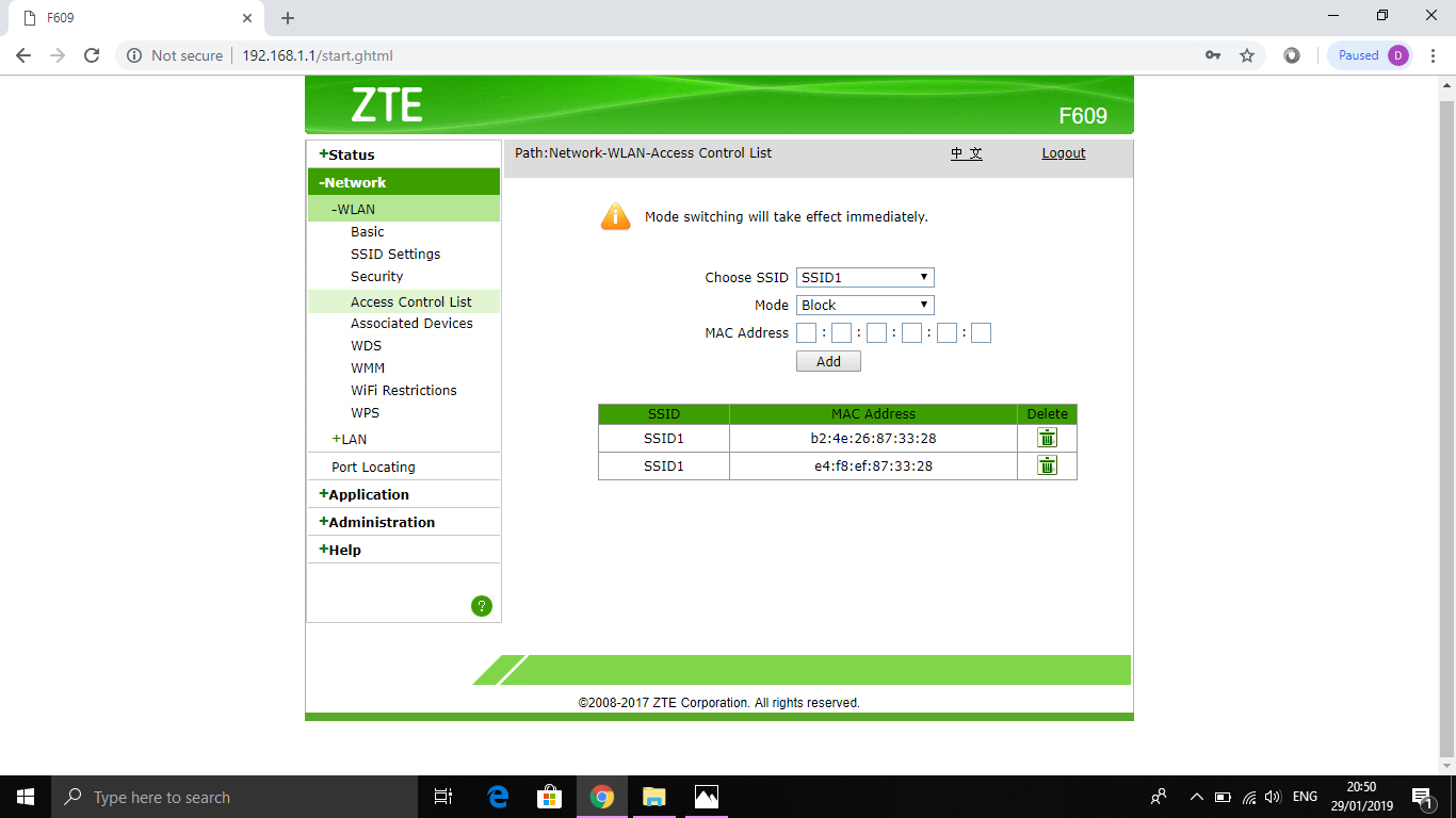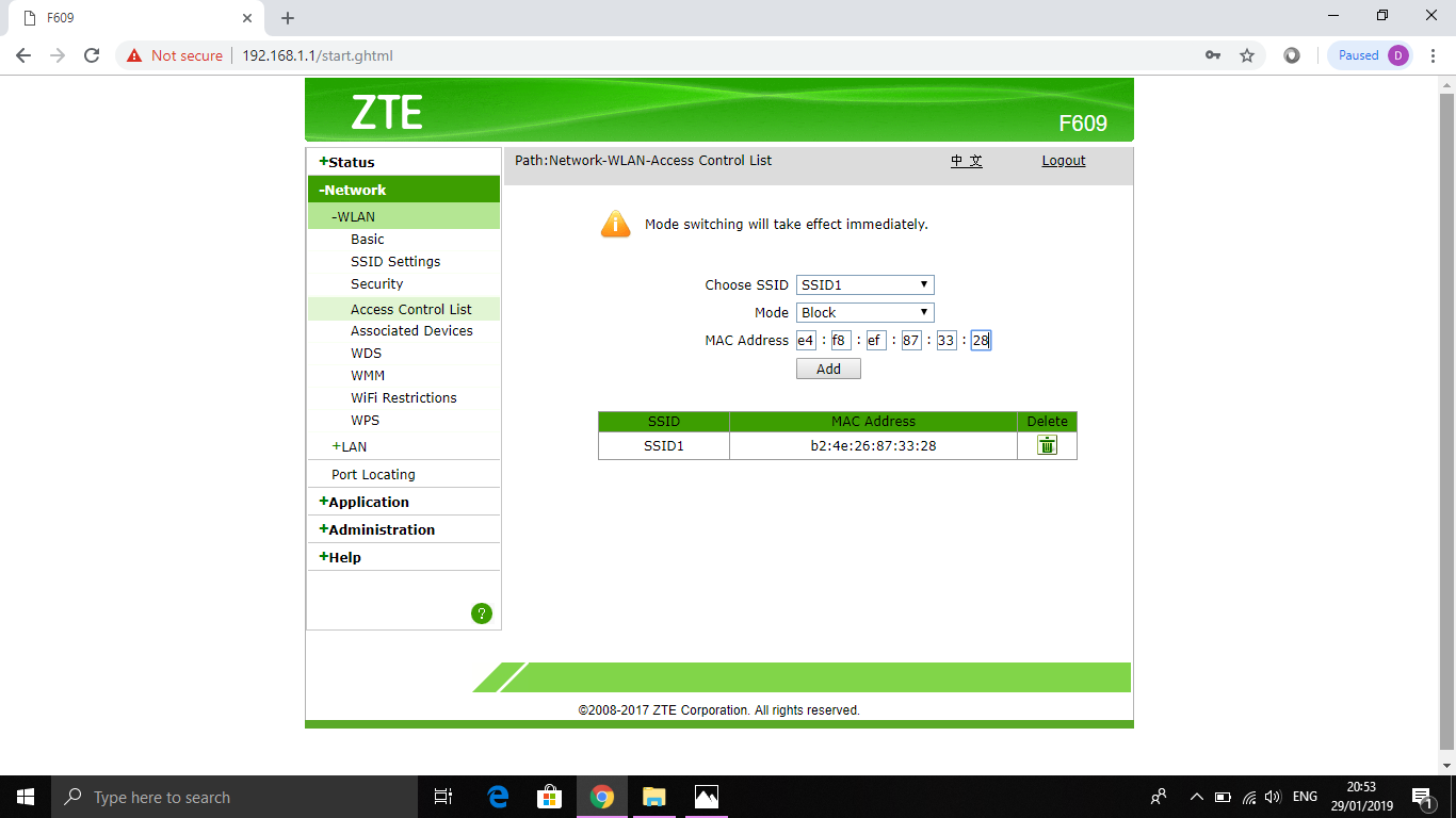7. Selanjutnya klik Network – WLAN – Access Control List untuk mendaftarkan perangkat yang ingin diblokir. Atur Choose SSID = SSID1 | Mode = Block | MAC Address = e4 f8 ef 87 33 28 (MAC Address perangkat) lalu klik Add.