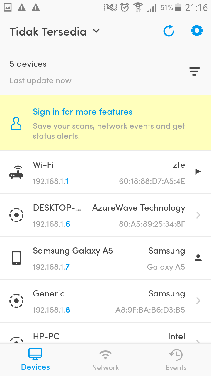 1. Sebelumnya, untuk mengetahui daftar pengguna yang terhubung dengan Jaringan Wifi, kita bisa menggunakan aplikasi Fing di Android. Disana akan ditampilkan informasi lengkap mengenai perangkat-perangkat tersebut.