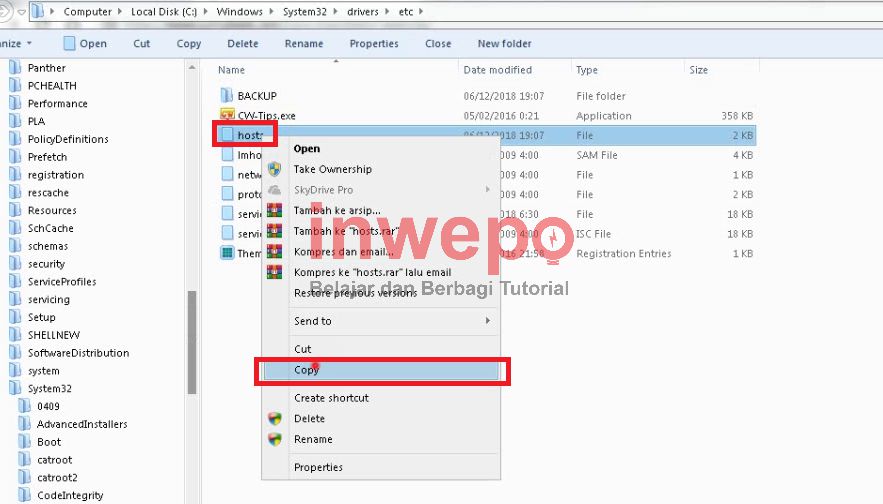 3. Jika sudah, kamu klik kanan pada berkas hosts dan kamu klik Copy.