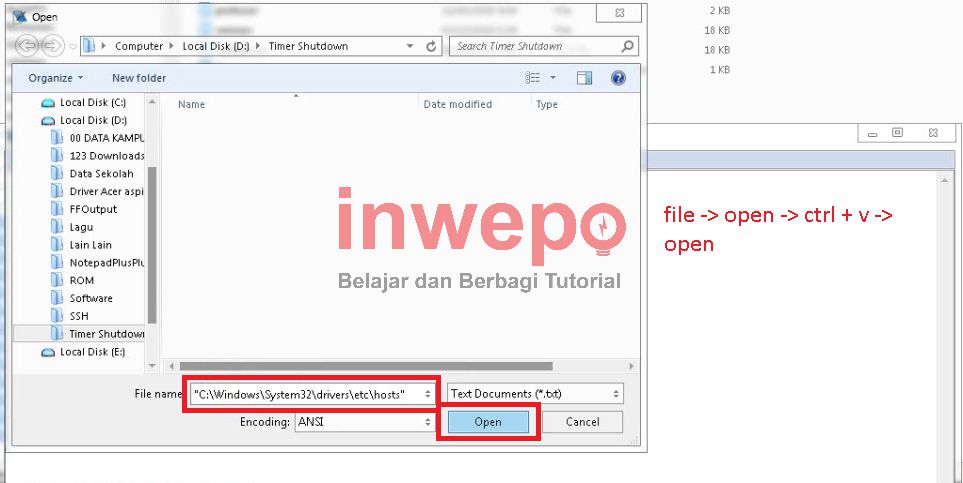 4. Kembali ke aplikasi notepad, kamu klik menu tab file – open dan kamu klik pada textbox dan pada keyboard tekan ctrl + v dan akan muncul secara otomatis akan muncul teks C:\Windows\xxxxxxx\drivers\etc\hosts dan kamu klik pada tombol open.