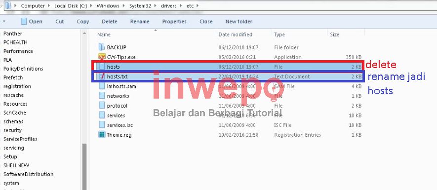 7. Jika sudah, maka disini akan muncul 2 jenis file dengan nama yang sama, yaitu hosts dan hosts.txt, kamu delete berkas hosts dan kamu rename berkas hosts.txt menjadi hosts.