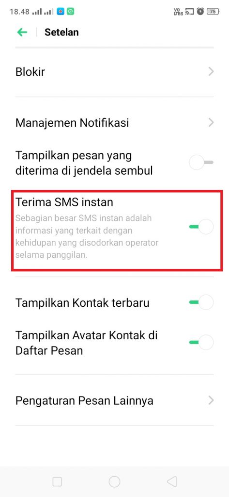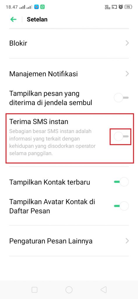 4. Untuk menghentikan mendapatkan SMS terus menerus dari operator seluler, kita hanya perlu menon-aktifkan fitur ‘Terima SMS Instan’.