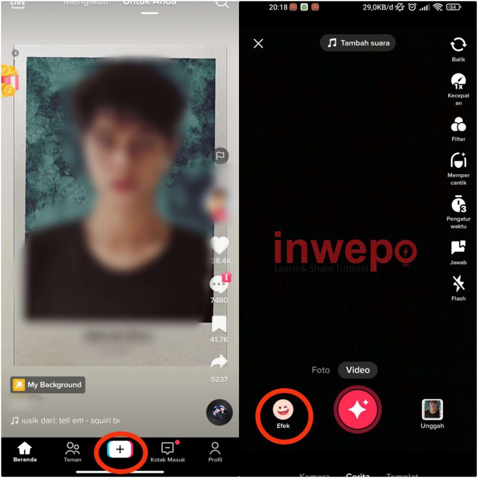 1. Buka aplikasi Tiktok kalian lalu tap icon plus yang berada di bagian tengah, selanjutnya tap icon efek.