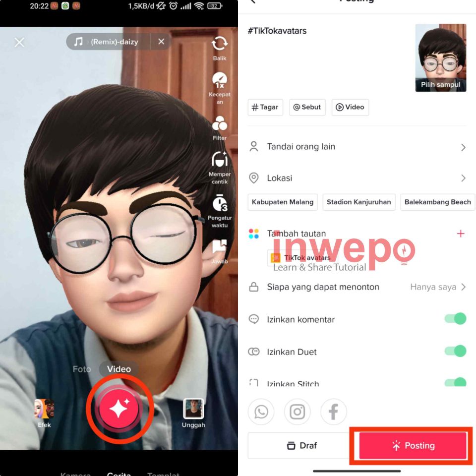 5. Kalian tinggal merekam saja menggunakan menu shutter yang ada di bagian tengah dengan Avatar yang sudah kalian sesuaikan sebelumnya, dan kemudian memposting konten seperti biasanya.