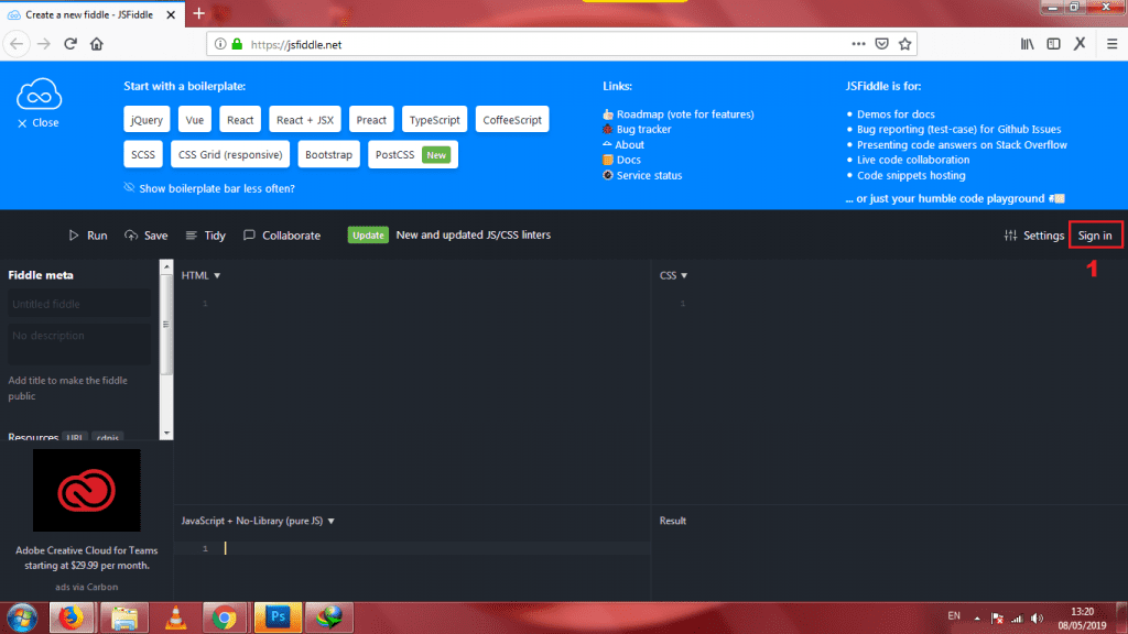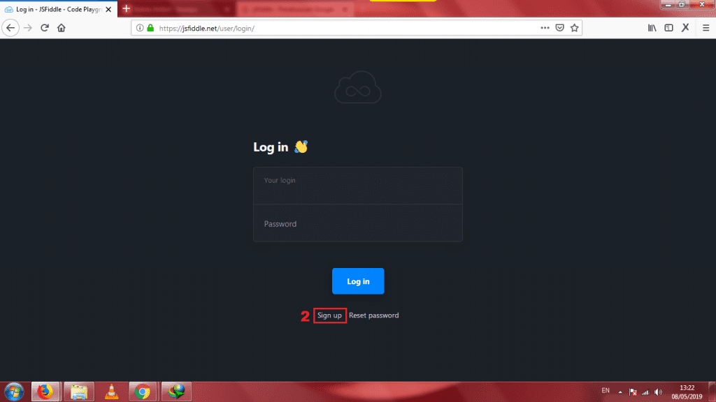 Penulis akan memberikan tutorial cara membuat akun baru di JSFiddle. Ini berguna untuk menyimpan hasil project yang kamu kerjakan selama ini.