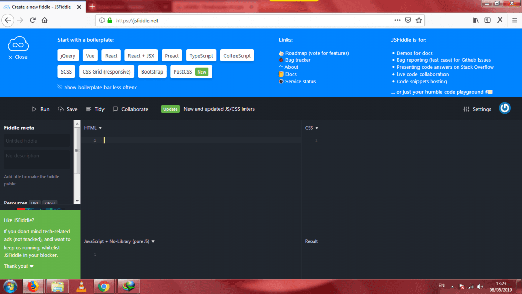 JSFiddle adalah salah satu situs web yang menyediakan tempat untuk belajar bahasa pemrograman dengan mengetik coding yang berhubungan dengan web (HTML, CSS, dan JS) yang populer saat ini. Website ini telah diberi fitur hasil output sehingga tidak perlu buka halaman yang lain. Bahkan kamu bisa belajar pemrograman web berbasis framework seperti Bootstrap, Vue.js tanpa perlu instal plugin. JSFiddle ini menyediakan text editor untuk mengetik kode script.