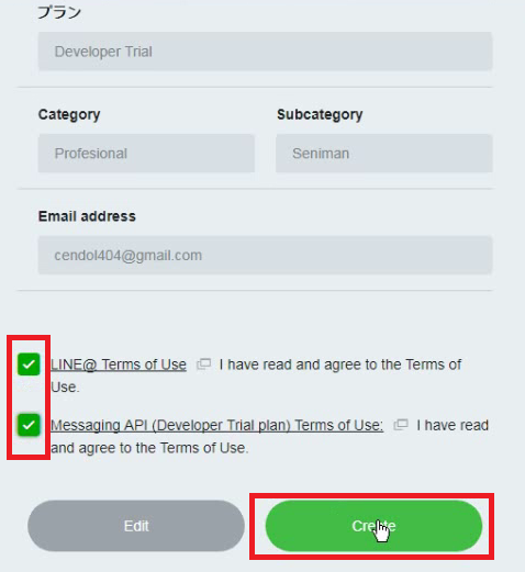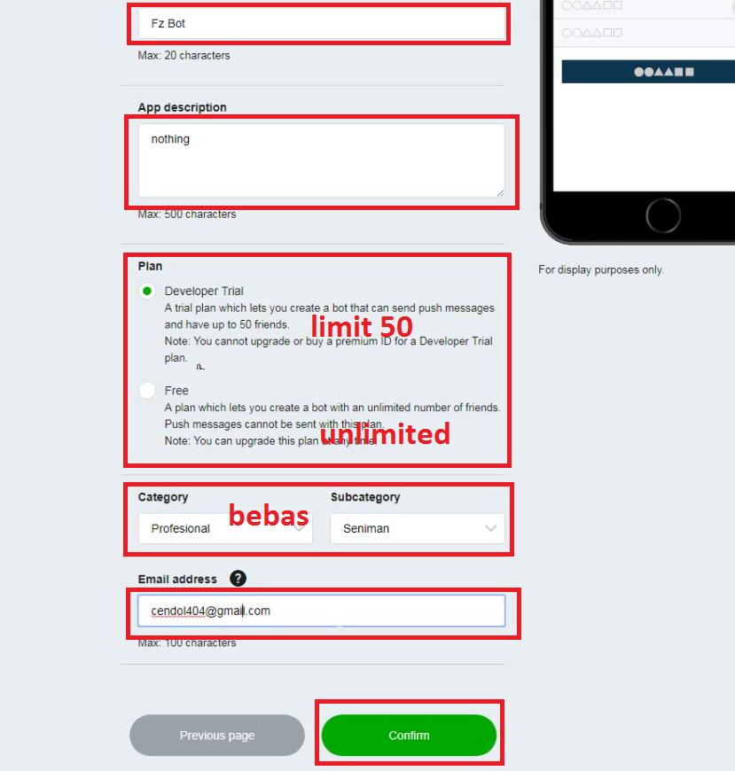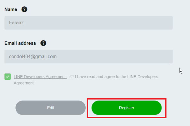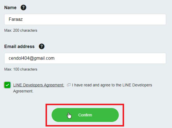 12. Dan isi Nama dan Email Address lalu centang pada bagian Line Developers Agreement, jika sudah klik tombol Confirm.