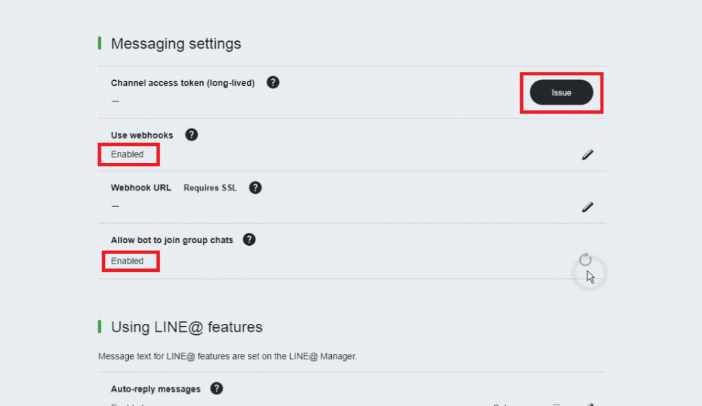 20. Ubah Use webhooks menjadi enabled, ubah Allow bot to join group chats menjadi enabled dan klik tombol Issue.
