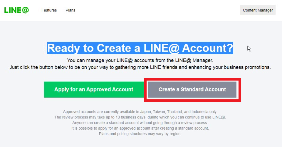2. Lalu klik tombol Content Manager atau Create New LINE@ Account.
