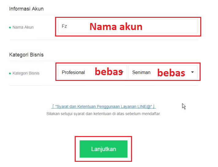 7. Silahkan kamu isi Nama Akun, Kategori Bisnis (Bebas) dan jika sudah klik tombol Lanjutkan.