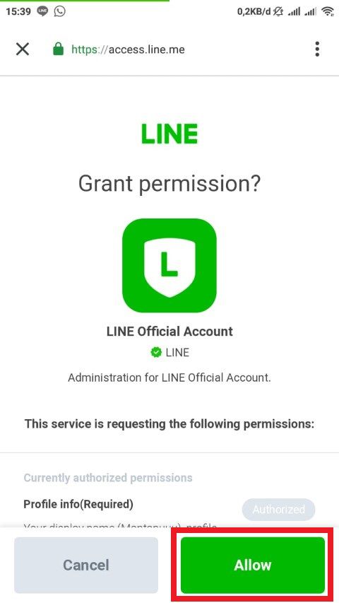5. Kamu akan diminta untuk melakukan konfirmasi persetujuan penggunaan aplikasi Line Official Account, kamu tap saja pada tombol Allow (pada beberapa kasus, tampilan ini akan muncul ketika kamu ingin login, atau ketika kamu selesai membuat Official Account pertama kamu, pada kasus penulis sendiri untuk tampilan ini muncul ketika sudah membuat OA pertama di aplikasi ini).