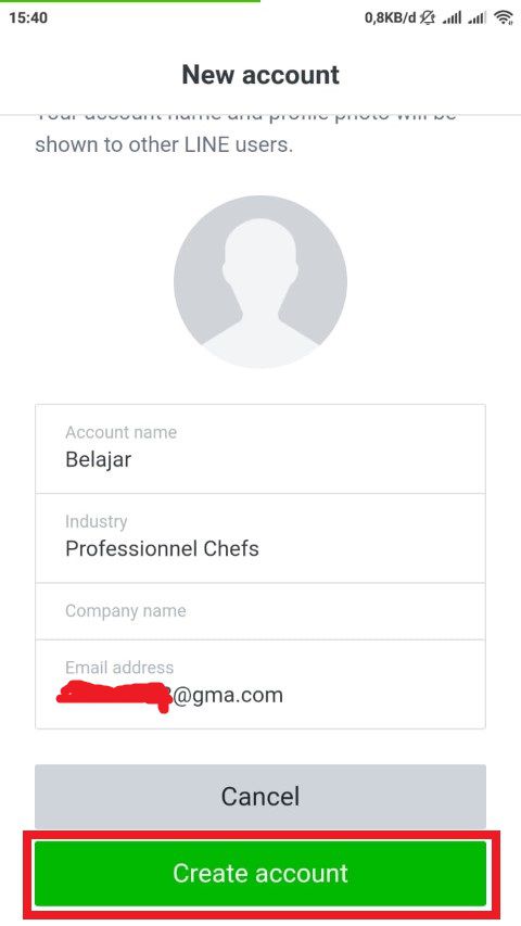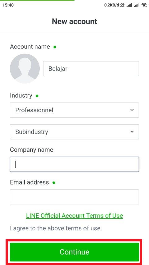 3. Jika kamu sudah login, jika misalnya akun Line kamu belum memiliki Official Account sebelumnya, kamu akan diminta untuk membuat Official Account, isi semua kolom yang tersedia dan jangan lupa untuk memberika foto profilenya, jika sudah terisi kamu tap tombol continue.
