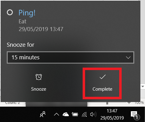 5. Selesai, kamu hanya perlu menunggu pada waktu yang kamu tentukan dan akan muncul notifikasi alarm seperti gambar di bawah ini. Kamu klik complete untuk mematikan alarm.
