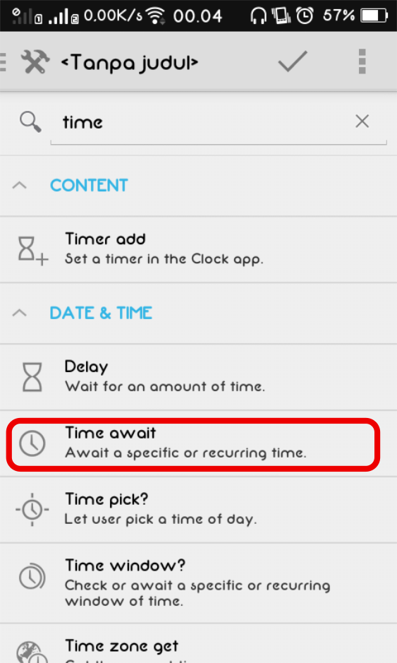 4. Pada kolom pencarian, ketik Time, lalu pilih opsi Time await.