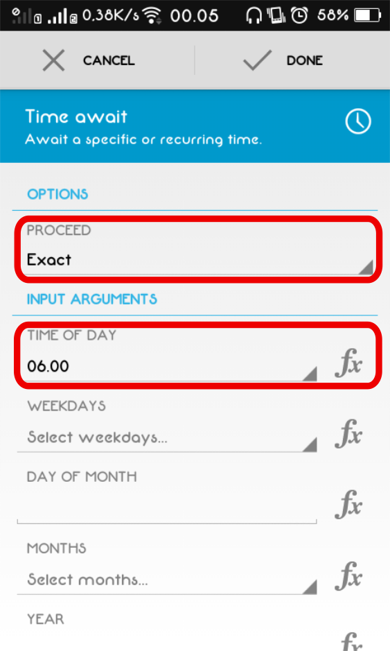 5. Pada bagian Time await, atur Proceed menjadi Exact, lalu isi kolom Time of day dengan waktu alarm berbunyi. Jika sudah, klik Done pada bagian atas aplikasi.