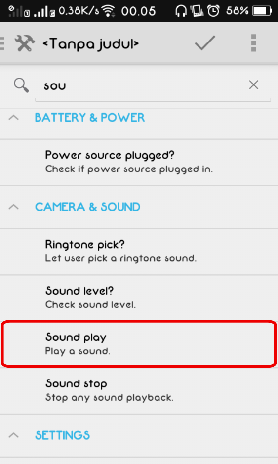 8. Pada kolom pencarian, ketik Sound, lalu pilih opsi Sound play.